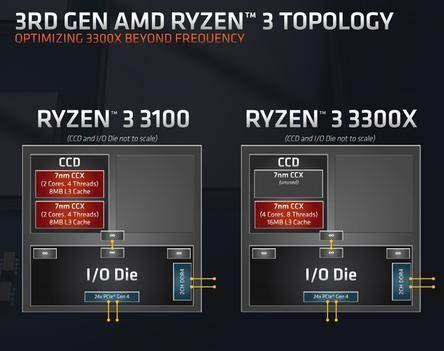 從數量上說,2+2=4,但實際應用中并不完全是這么回事。每個CCX擁有各自獨立的L3緩存,當計算任務在不同CCX之間切換的時候將會產生額外的延遲。簡單來說,Ryzen 3 3100的延遲會比Ryzen 3 3300X大,即你把3100超頻到3300X的水平,實際使用速度也不如后者快。