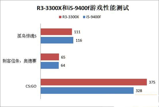 游戲測試中,R3-3300X和i5-9400f的表現互有勝負。ZEN2架構的4核8線程的R3-3300X的確沒有令人失望,即使是負載極高的《刺客信條:奧德賽》也有不錯的表現,而《CS:GO》這款網游幀數更是犀利,比i5-9400f領先15%左右。