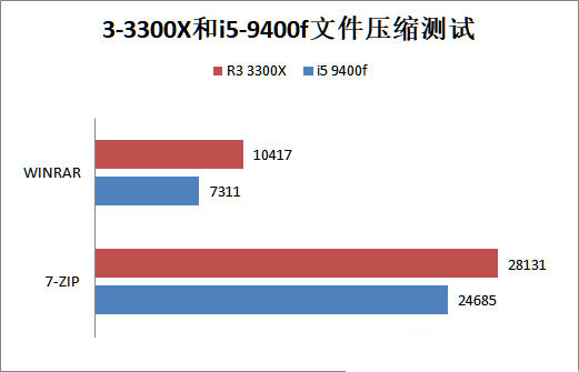 文件壓縮能力同樣是對CPU多線程的一種應用,一般情況下壓縮和解壓縮操作都可以將CPU的全部線程都調用起來,能反應處理器的全面性能,也可以看做多核心測試的一種。在該項測試中,R3-3300X的成績都要比i5-9400f更高一些。