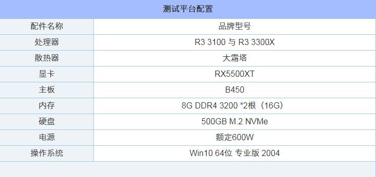 我們來通過專業軟件分別對AMD銳龍R3 3100和R3 3300X兩款CPU進行實測,看看兩者之間的性能差距,測試平臺配置如下。