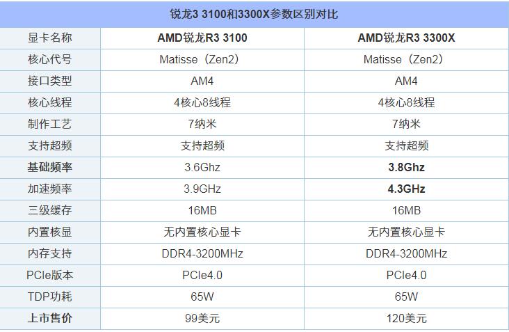 AMD銳龍R3 3100和R3 3300X哪款好?AMD三代Zen2架構又增添了新成員,分別是AMD銳龍R3 3100和R3 3300X兩款處理器,其中R3 3100上市指導價格為99美元,而R3 3300X上市指導價格為120美元,預計5月份發售。這兩款處理器差了大約20美元,那么AMD銳龍R3 3100和R3 3300X區別大嗎?感興趣的朋友快來了解一下吧。