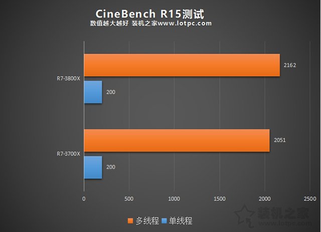 CineBench R15的性能測試中,單核性能方面,R7-3800X和R7-3700X基本持平,而在多線程方面,R7-3800X領先只有5%左右的差距。