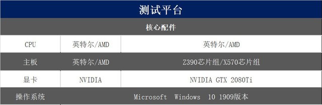 測試平臺上, 我們使用了目前英特爾頂級的Z390以及AMD頂級X570平臺,顯卡則是RTX 2080Ti,其余硬件配置一樣,能夠減少測試帶來的誤差。