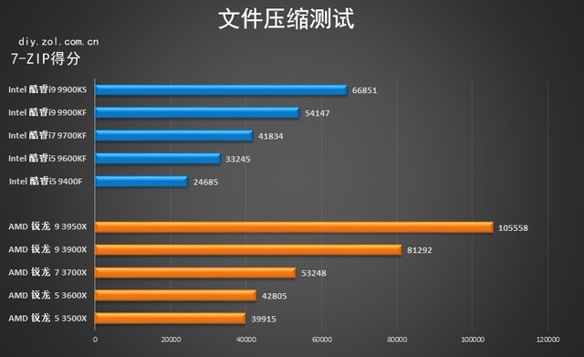 而在7-ZIP的壓縮能力測試的得分中,AMD Ryzen 9 3950X再次大幅度領先,在壓縮速度測試當中,主打綜合性能的三代銳龍處理器表現非常出色。