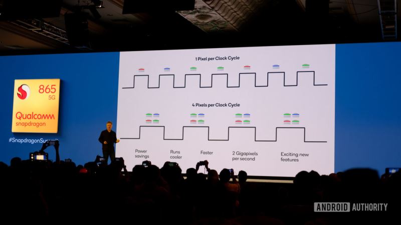 驍龍865搭載Spectra 480 ISP。對應每秒20億像素處理效率、每運算周期可處理畫素數(shù)量提升了4倍。最高支持2億像素相機以及5攝像頭配置。高通表示,他們降低了ISP的時脈,以達到更好的省電降溫效果。