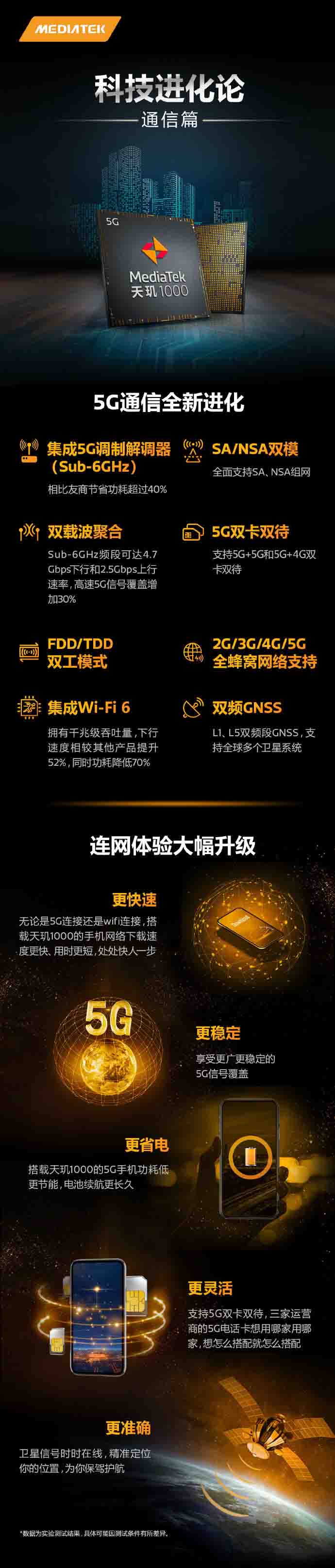 天璣1000集成5G調制解調器(Sub-6GHz),相比友商節省功耗超過40%,支持SA/NSA雙模組網,5G體驗更好;支持雙載波聚合,Sub-6GHz頻段可達4.7Gbps下行和2.5Gbps上行速率,高速5G信號覆蓋增加30%;支持5G+5G和5G+4G雙卡雙待,用戶可以任意組合;天璣1000集成Wi-Fi6,擁有千兆級吞吐量,下行速度相較于其他產品提升52%,同時功耗降低70%;支持雙頻GNSS。