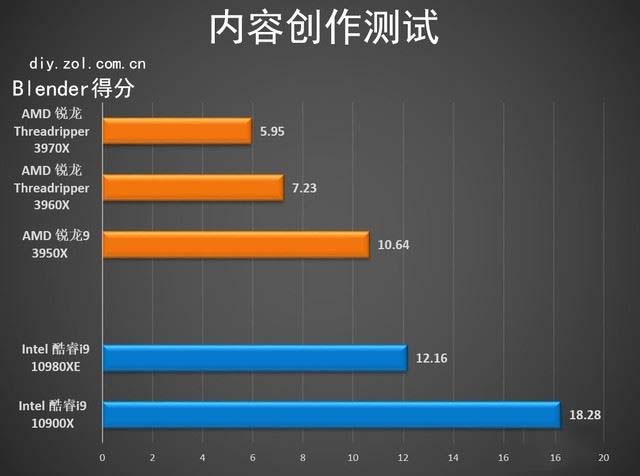 AMD 銳龍Threadripper3970X的渲染只用了5.95s,比銳龍9 3950X快了一倍。