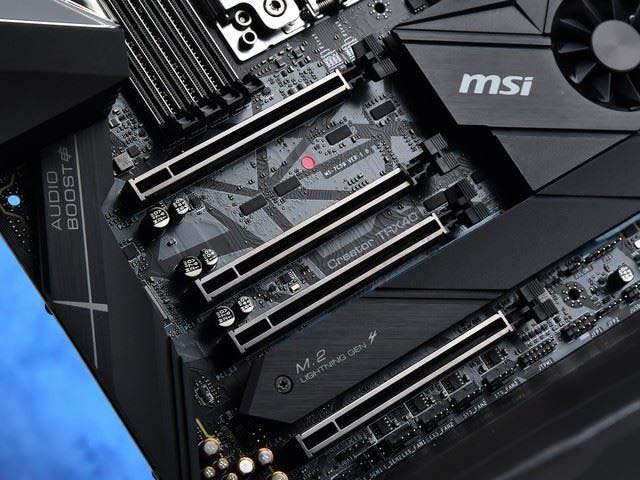 微星Creator TRX40主板提供了4個(gè)PCIe 4.0 x16插槽,支持模式為x16/x8/x16/x8,都裝備了金屬保護(hù)裝甲,支持PCIe 4.0,帶寬可達(dá)64GB/s。