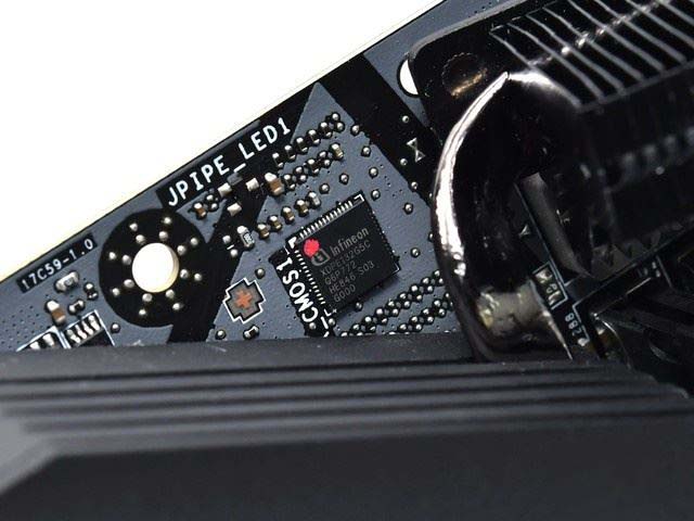 而擁有如此強(qiáng)力的光效同時(shí)在下面的VRM散熱器上,微星使用了全鋁設(shè)計(jì),堆疊式散熱片,并且用一根超長(zhǎng)的散熱銅管貫穿整個(gè)主板高溫區(qū),一直延伸到了芯片組附近。