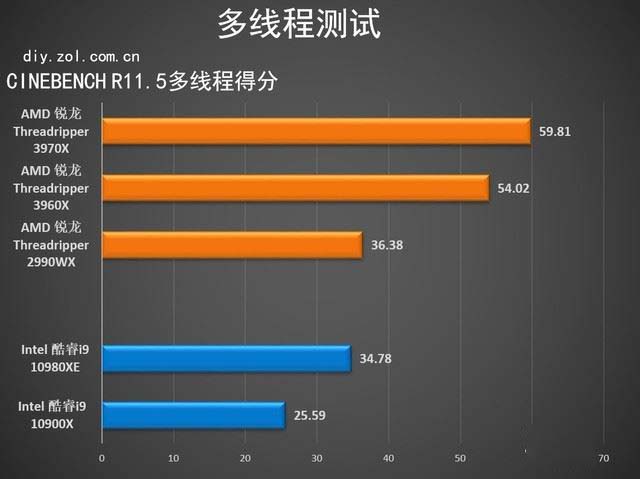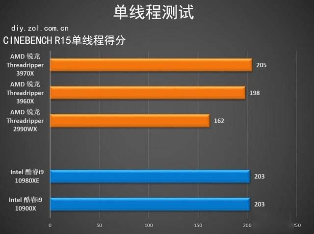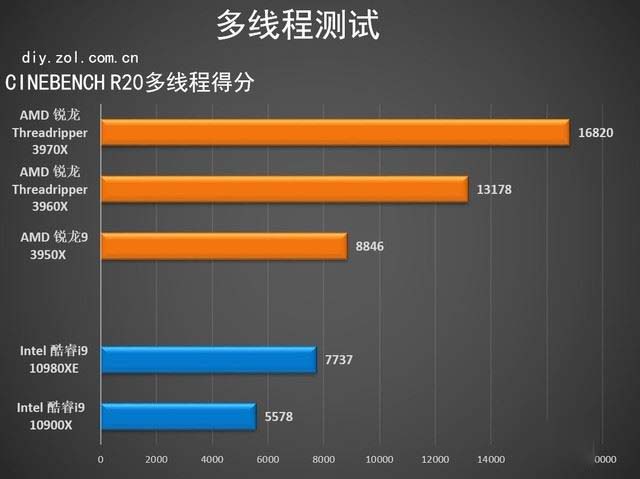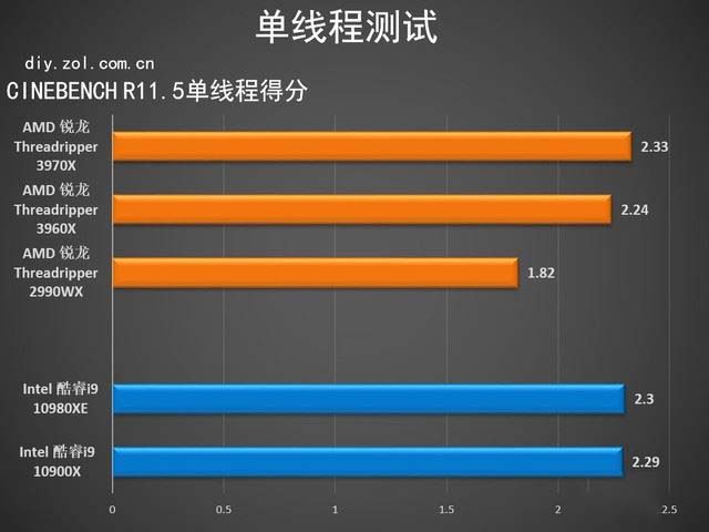 三代線程撕裂者單線程測(cè)試的結(jié)果很驚喜,32核心的AMD銳龍Threadripper 3970X和24核心的AMD銳龍Threadripper 3960X表現(xiàn)的都非常不錯(cuò),7nm Zen2架構(gòu)提升太大了,讓AMD處理器單核心性能暴漲。動(dòng)態(tài)加速4.5GHz的單核頻率得到了充分發(fā)揮,對(duì)比上代旗艦2990WX處理器在CINEBENCHR15中甚至提升了26%以上,比官方宣稱的提升21%還要高。