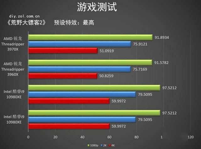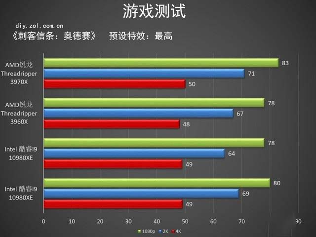 明顯的看出第三代AMD 銳龍Threadripper3970X在游戲上也能保證很好的體驗(yàn),目前游戲的單核心頻率需求已經(jīng)接近瓶頸,優(yōu)化將會(huì)是關(guān)鍵問題。