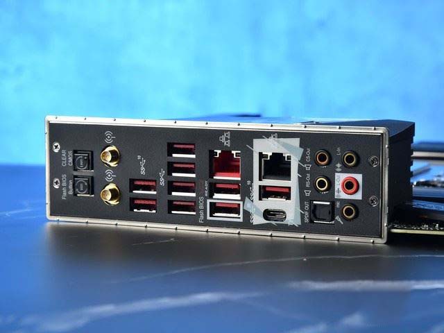 在I/O區(qū)域,這款主板準(zhǔn)備了5個(gè)USB 3.2 Gen2 Type-A接口,4個(gè)USB 3.2 Gen1 Type-A接口,一個(gè)USB 3.2 Gen2x2 20G Type-C接口,還有一個(gè)Clear CMOS按鈕用于重置BIOS,此外這款主板還搭載了Intel® WIFI 6無線網(wǎng)卡和10G L網(wǎng)絡(luò)接口 以及 Intel® Gigabit網(wǎng)絡(luò)接口。