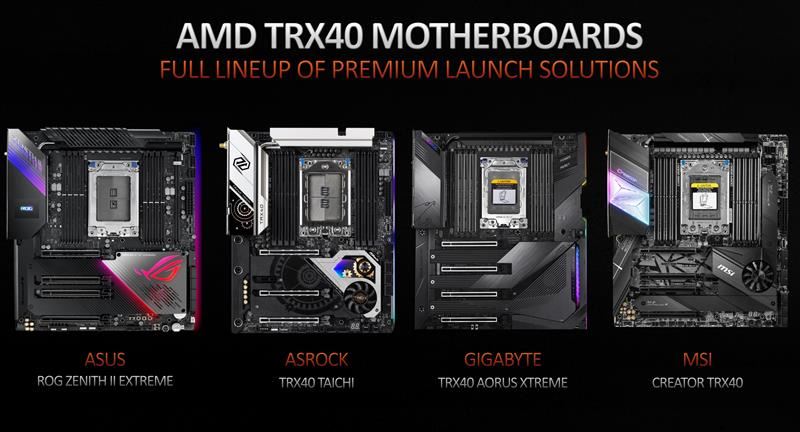 目前,各大主板廠商都已經備好了全新的TRX40主板,旗艦級的有華碩ROG ZENITH II EXTREME、微星CREATOR TRX40、技嘉TRX40 AORUS EXTREME、華擎TRX40 TACHI,均正在陸續上市。