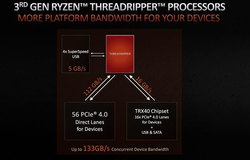 三代ThreadRipper平臺的帶寬可以是異常恐怖。處理器對外部設備開放56條PCIe 4.0,總帶寬112GB/s,四個USB 3.1接口總帶寬5GB/s,再加上與芯片組之間的16GB/s,平臺并發總帶寬高達133GB/s!