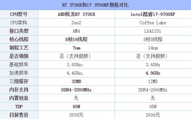我們先來看看R7 3700X和i7 9700KF參數(shù)對比,初步來了解一下兩者性能差距,i7-9700K相比i7-9700KF只多了一個UHD630核顯,其它參數(shù)保持一致,所以性能都是相同的,可以完全參考本文,來看看吧。