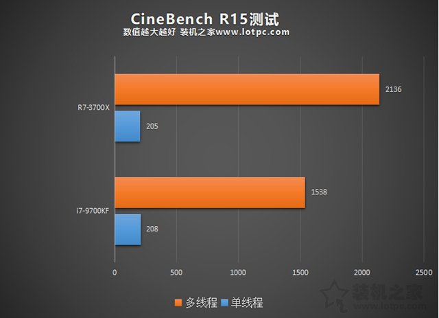 CineBench R15測試中,與R20測試結(jié)果相似,i7-9700KF略有領(lǐng)先,而R5-3700X在多線程性能領(lǐng)先了38.8%。