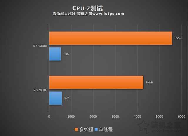 CPU-Z基準(zhǔn)測試中,i7-9700KF在單核性能領(lǐng)先了7.2%,略強(qiáng)一些,而多線程性能方面,R7-3700X領(lǐng)先了30%。