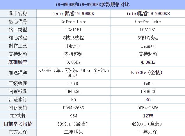 我們先來看看i9-9900K和i9-9900KS兩者參數對比,先初步來了解一下兩款CPU的性能差異,來看看如下參數對比表格。
