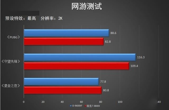 2K分辨率下的測試中,二者各有勝負(fù),i5-9600KF在《PUBG》和《守望先鋒》中勝出,AMD銳龍 7 3800X則在《堡壘之夜》中更勝一籌,但兩者差距不大,只有3幀。
