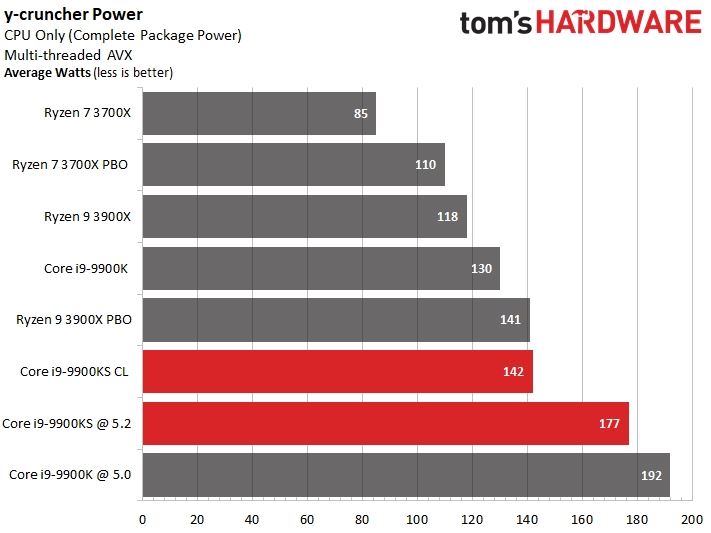 多線程AVX測試的時候則分別是142W、177W,后者比i9-9900K低了15W。