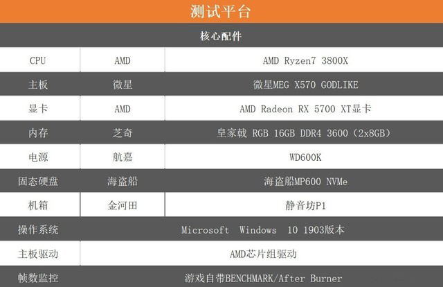 先給大家介紹一下測試平臺,這次我們使用及微星MEG X570 GODLIKE、AMD 銳龍7 3800X處理器和AMD Radeon RX 5700 XT組成了標準的3A平臺,加上兩條3600MHz頻率的皇家戟來征戰60年代艾澤拉斯。