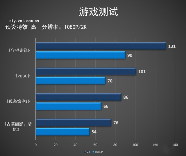 我們使用了《PUBG》、《守望先鋒》兩款FPS游戲,以及《古墓麗影:暗影》和《孤島驚魂5》2款3A游戲一起測試。在游戲測試中畫面選項均采用高畫質,分別以1080P和2K分辨率進行測試。