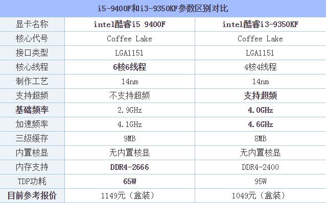 首先我們先來了解一下intel酷睿i5 9400F和i3-9350KF參數(shù)對比情況,先來初步了解一下兩款CPU的規(guī)格差異,如下。