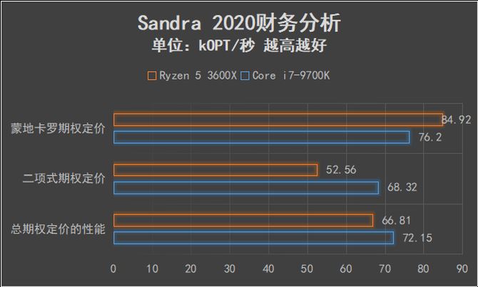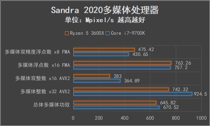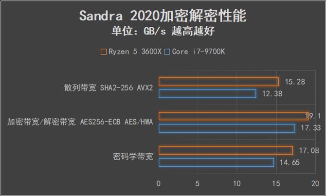Sisoftware Sandra中的很多測試項目幾乎都要用到AVX2指令集,對處理器的浮點性能非常敏感,而這也是此前AMD一代、二代銳龍處理器的弱勢項目。此次“Zen2”架構的第三代銳龍處理器浮點單元位寬加倍,反映在測試結果上,銳龍5 3600X在Sisoftware Sandra的各項測試中和定位更高的酷睿i7-9700K相差不大,可謂是補足了此前的短板。