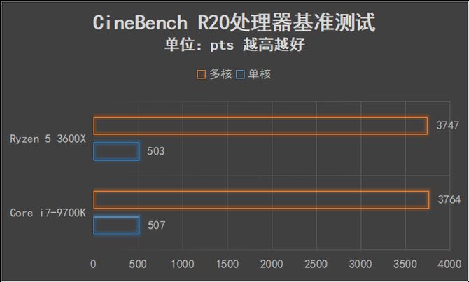 銳龍5 3600X在R20測試中的單核得分為503pts、多核得分3747pts,和酷睿i7-9700K的成績幾乎相同,微小的差別甚至可以算作誤差。