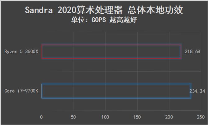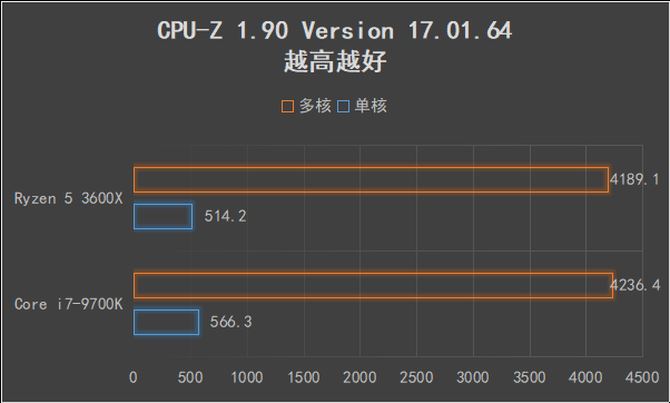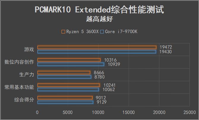 可以看到,在綜合得分上銳龍5 3600X和價格更高的酷睿i7-9700K相差無幾,具體到四個側重不同的項目,二者互有勝負。