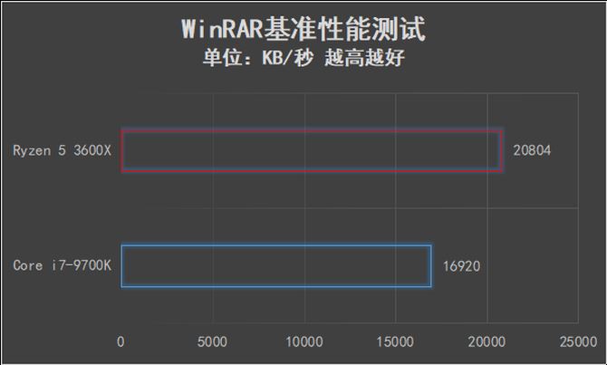 而在另一款常用的解壓縮軟件WinRAR(版本571)的基準測試中,銳龍5 3600X的性能表現也非常出色,同樣比酷睿i7-9700K速度快出一些。