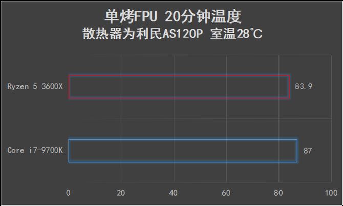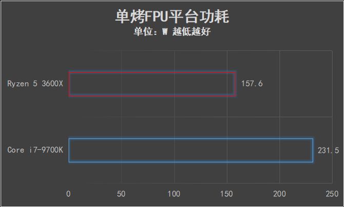 在室溫28℃的環境下,使用AIDA64自帶的系統穩定性測試進行單烤FPU 20分鐘后,銳龍5 3600X的頻率穩定在4.05GHz上下,RYZEN MASTER自帶的溫度監測顯示為83.9℃,通過功率檢測儀顯示的平臺功耗為157.6W。與之對比,在同樣環境下,i7-9700K單烤FPU 20分鐘后,核心溫度高達87℃,整機平臺功耗231.5W。可在7nm工藝的加持下,銳龍5 3600X能耗比表現較為出色。