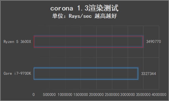 CoronaRenderers是一款全新的高性能照片級高真實感渲染器,在corona 1.3版本的基準測試中,銳龍5 3600X的平均速度高達3490770Rays/sec,性能上相比酷睿i7-9700K有一定優勢。