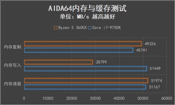 全新的“Zen2”架構改進了內存控制器,使其獲得更強的兼容性,銳龍5 3600X可完美適配3600MHz C16高頻內存,在AIDA64內存與緩存測試中,內存復制速度高達49326MB/s、內存讀取速度高達51974MB/s,相比酷睿i7-9700K有小幅優勢。不過由于銳龍5 3600X為單die設計,內存寫入帶寬被大幅降低,速度只有理論值的一半,但鑒于絕大多數用戶很少做需要大量數據寫回的密集計算,所以影響也不是很大。