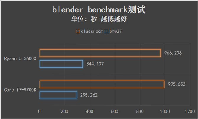 在Blender benchmark中的“bmw27”場景下,銳龍5 3600X花費344.137秒完成了渲染建模,相比酷睿i7-9700K慢了一些,但處理更復雜的“classroom”場景,銳龍5 3600X所花費的時間則會更短。