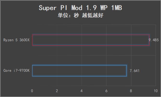 Super Pi對單核性能非常敏感,這也是英特爾的傳統優勢項目,銳龍5 3600X運算1M的時間為9.486秒,雖然相比主頻更高的酷睿i7-9700K還有差距,但相比此前的一代二代銳龍也有很大提升。