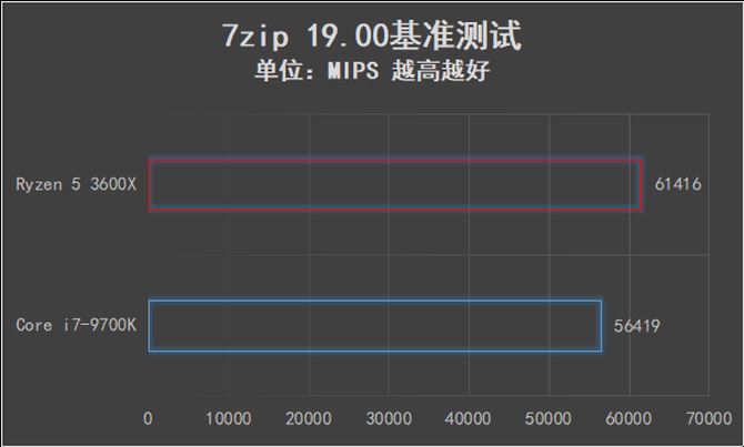 7-Zip是一款完全免費的壓縮解壓縮軟件,同其他壓縮軟件相比它的壓縮速度更快壓縮率更好,對超線程的支持非常好,銳龍5 3600X的基準測試得分高達61416MIPS,比價格更高的酷睿i7-9700K高了將近5000MIPS。