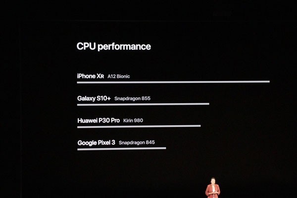在看發布會上看到這張圖的時候,我甚至懷疑這是否是蘋果的發布會。要知道,蘋果之前從未在iPhone發布會上拿出過和友商的對比圖,看來往常內心強大,對友商不屑一顧的蘋果心中已經有些忐忑不安了。