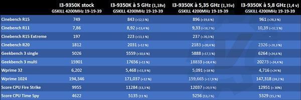 酷睿i3-9350K不只是有高頻率的優(yōu)勢(shì),實(shí)際上因?yàn)楹诵臄?shù)相對(duì)較少,它的超頻潛力反而更高了。法國(guó)vonguru網(wǎng)站之前就做了酷睿i3-9350K的默頻及超頻測(cè)試,如下所示: