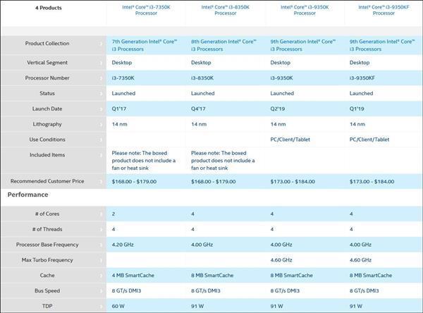 雖然都是酷睿i3,但是七八九代酷睿i3的K系列處理器已經(jīng)化繭成蝶了,酷睿i3-7350K還是2核4線程處理器,頻率4.2GHz,到了酷睿i3-8350K上升級(jí)到了4核4線程只是頻率略微降至4.0GHz。