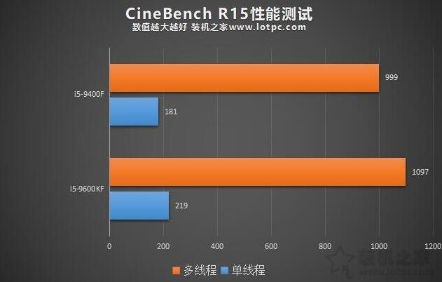在Cinebench R15的測試成績中,i5-9400F單線程成績獲得了181分,而i5-9600KF單線程成績獲得了219分,i5-9600KF強了17%。而在多線程測試中,i5-9400F成績為999分,而i5-9600KF成績為1097分,i5-9600K領先了9%左右。