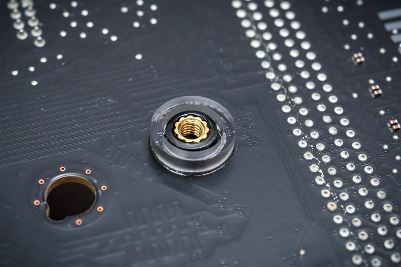 主板的背面有貼絕緣墊圈墊高背板。中間的銅柱是裝在正面的裝甲上,可以避免自攻螺絲直接擰塑料件導致容易損壞的問題。華碩的細節做工還是很不錯的。