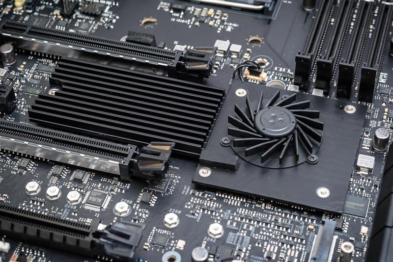 C8F的芯片組散熱片是目前我拆解下來X570主板中最大的,他向顯卡插槽之間延伸了很長的距離。相應的也使C8F并不需要很高的風扇轉速。