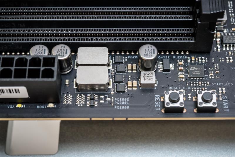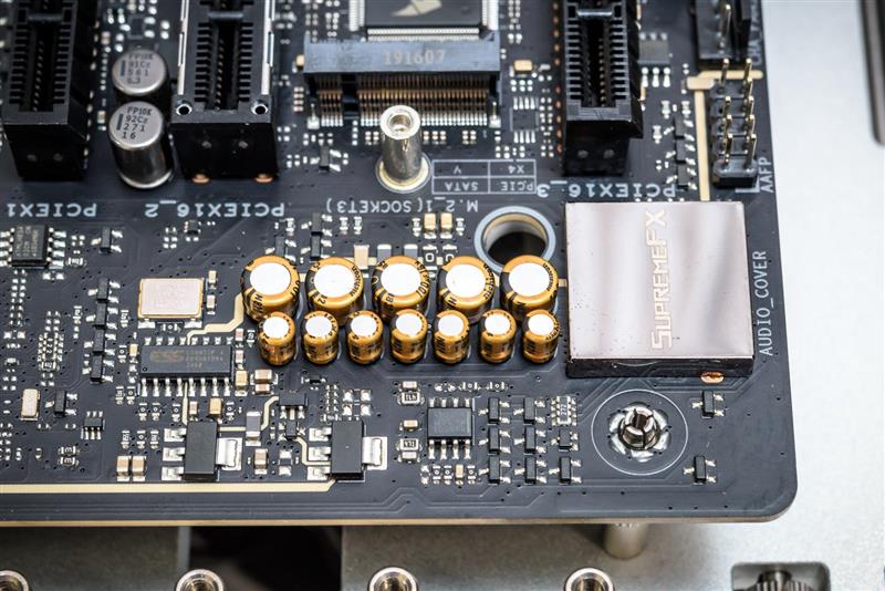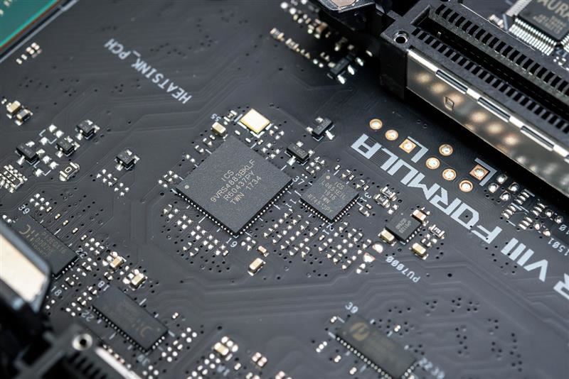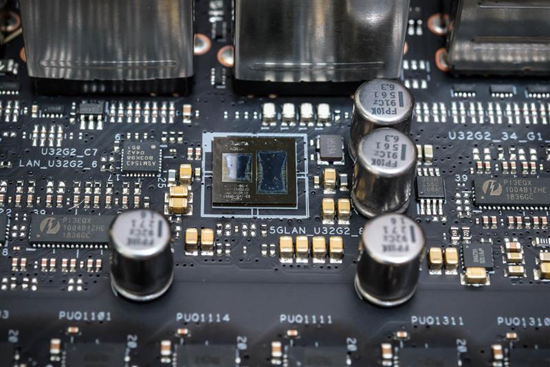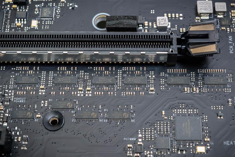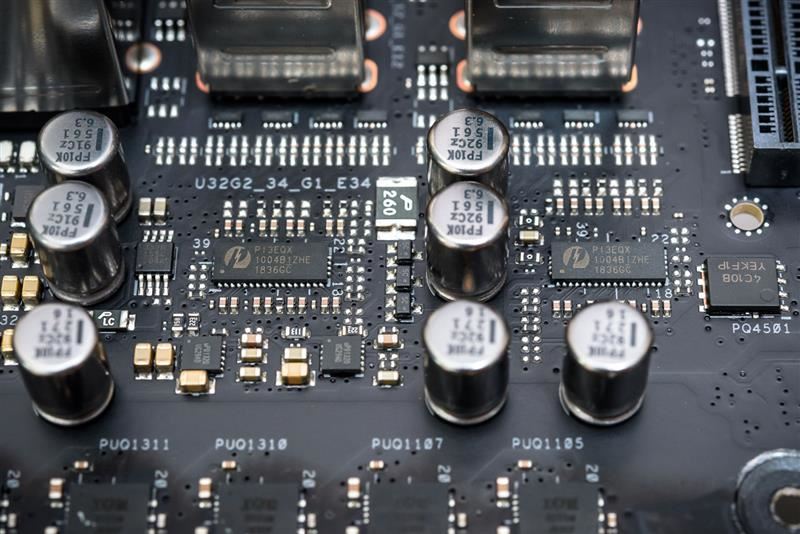 PCI-E X16旁邊可以看到6顆PI3EQX16芯片,這是用于PCI-E 4.0通道的中繼,保證PCI-E 4.0通道可以滿速運行。下面的4顆PI3DBS芯片是用于拆分PCI-E X16通道,讓兩根帶金屬裝甲的顯卡插槽可以運行在8+8模式。