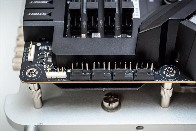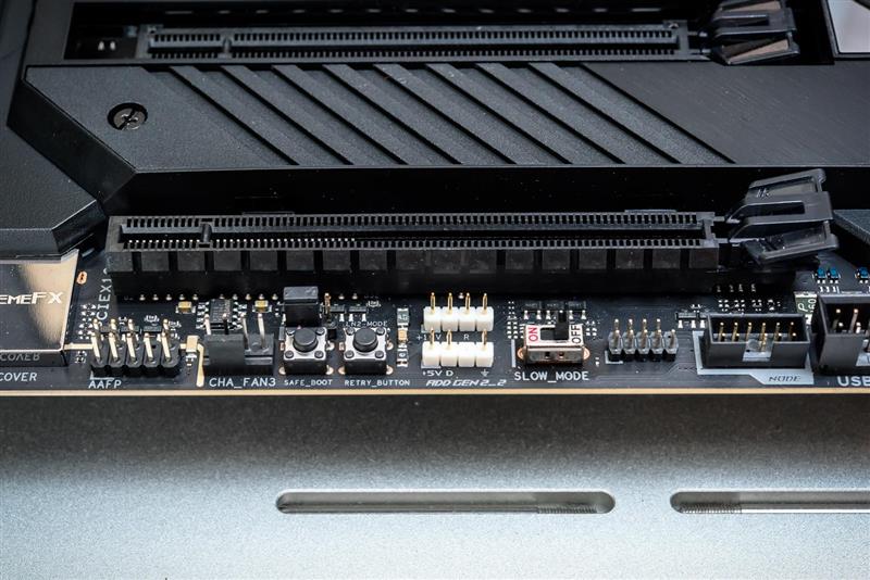 靠主板音頻部分一側,圖中左起分別為前置音頻、系統風扇、液氮模式(低溫啟動)+安全啟動按鍵、復位按鍵、RGB+數字 LED插座、啟動模式切換開關。