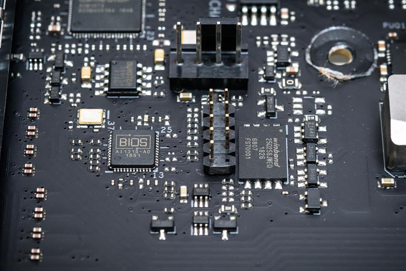主板BIOS為單芯片,不過配有可以快速刷寫的插座。旁邊寫著BIOS字樣的芯片是用于USB BIOS Flashback功能,型號為AI1315-AO。