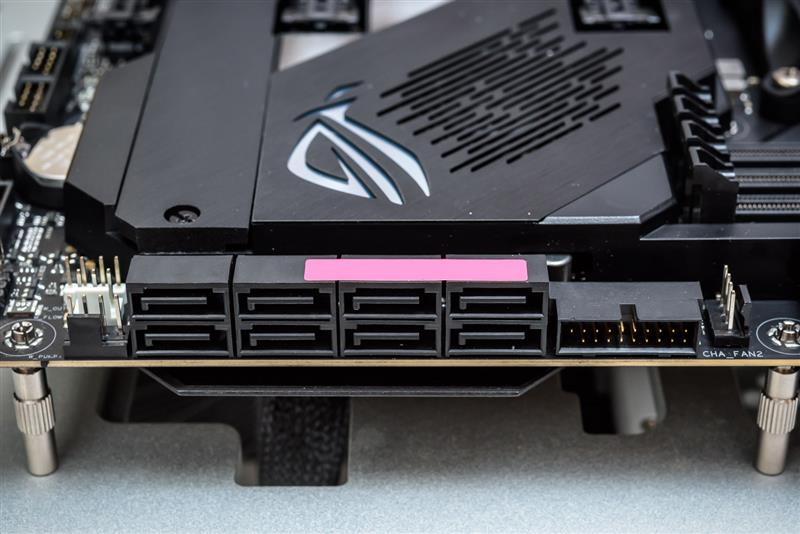 靠近芯片組這一邊,圖中左起為水冷系統插座+系統風扇插座、SATA 3.0*8、臥式前置USB 3.0。