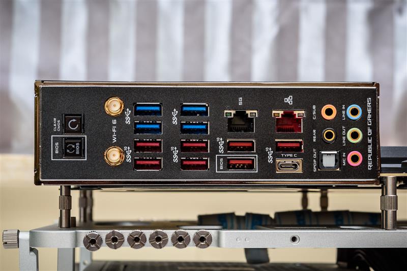 主板后窗接口也是相當豐富,從畫面左邊開始分別是,CLEAR COMS+USB BIOS Flashback按鈕;無線網卡接頭;USB 3.0*2+USB 3.1*2;USB 3.0*2+USB 3.1*2(USB BIOS Flashback*1);5G網卡+USB 3.1*2;千兆網卡+USB 3.1 A+C;3.5音頻*5+數字光纖。