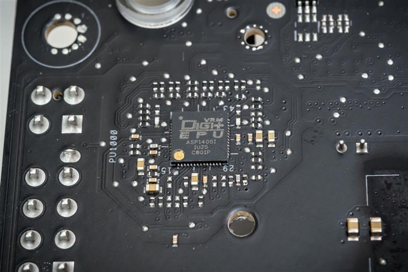 CPU供電為14+2相,供電PWM芯片為ASP14051,其實就是IR35201的定制版本;供電輸入電容為7顆尼吉康的FP10K固態電容(271微法,16V);MOS為每相1顆IR 3555M;輸出電感為每相1顆(感值R40);輸出電容為7顆尼吉康的FP10K固態電容(561微法,6.3V)。整個供電方案在X570中屬于高配,對付三代銳龍是綽綽有余。