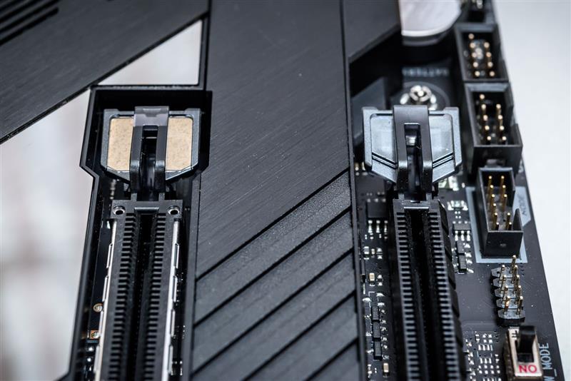 主板的兩個M.2 SSD插槽都是放在PCI_6的位置,上面覆蓋了一片金屬散熱片。圖中靠右的M2_2是直聯CPU引出的,靠左的M2_1是走芯片組的。